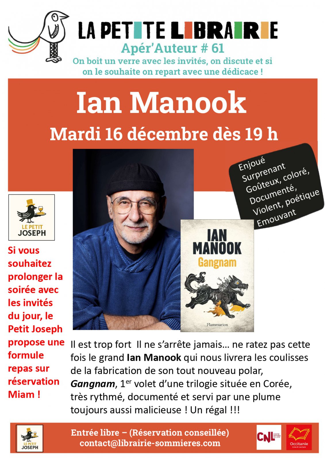 Il est trop fort Il ne s’arrête jamais… ne ratez pas cette fois le grand Ian Manook qui nous livrera les coulisses de la fabrication de son tout nouveau polar, Gangnam, 1er volet d’une trilogie située en Corée, très rythmé, documenté et servi par une plume toujours aussi malicieuse !